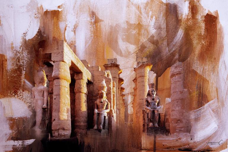 This artwork captures the grandeur of ancient Egyptian ruins with a blend of realism and abstract expressionism. The towering statues of seated pharaohs, surrounded by monumental stone pillars, evoke a sense of mystery and timelessness. The earthy tones and sweeping brushstrokes give the scene a dre...
