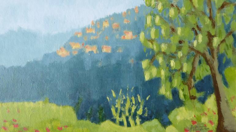 Imagine mountains standing tall through the ages, silent witnesses to the ebb and flow of time. This acrylic painting on cardboard captures a serene landscape, a small village nestled in nature's embrace, where a sense of harmony and balance prevails. Painted en plein air, this piece brings the out...