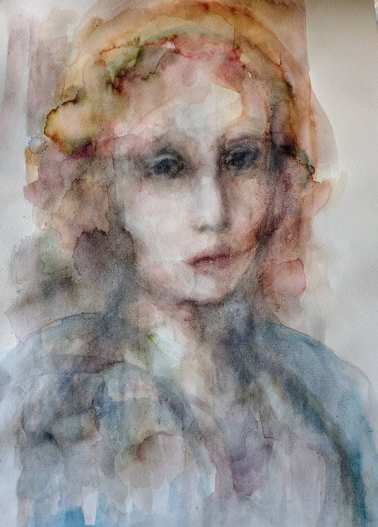 Angela , portrait, face, woman, angel , expressionism, figurative, modern, contemporary, watercolor, paint, paper