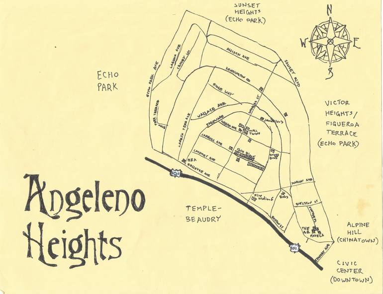 Angeleno Heights is a small neighborhood known for its Eastlake, Queen Anne, and Craftsman architecture. I explored in 2010 for my series, "California Fool's Gold" and drew this map, which is included in the piece.