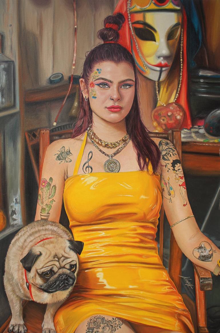 Brazilian painter, born in 1990 in the countryside of São Paulo. From childhood, she developed a deep connection with art, exploring various artistic modalities such as photography, fashion design, music, painting, and sculpture. She graduated with a degree in Visual Arts in 2010 and has since dedicated herself exclusively to painting. Her works combine a realist style with elements of fantasy and personal expression, highlighting a contemporary aesthetic of female characters. They are highly detailed, incorporating influences from pop art, urban culture, impressionism, surrealism, and symbolism. The characters in her works embody a modern style, influenced by pop culture, fashion, and cultural diversity. The vibrant colors bring an intense visual energy. Although the figures are depicted in a realistic manner, certain elements suggest something beyond the ordinary, conveying powerful emotions or a symbolic narrative, creating a dramatic and dynamic atmosphere. The use of saturated colors and the contrast between the figures and the background generate a modern and stylized feel, almost photographic in some aspects, yet with artistic touches that distance them from a mere reproduction of reality.