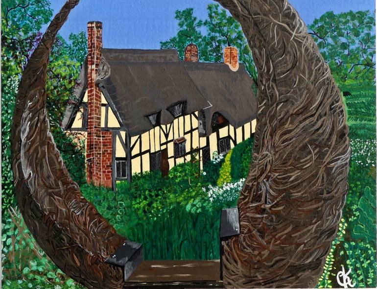 A trip to Stratford upon Avon as a surprise treat for our anniversary had me in awe of all the old buildings and the trail of William Shakespeare. Between us we took many photos but the view of the cottage from behind the wicker seat was just irresistible, I had to paint it. To me it looks just like...