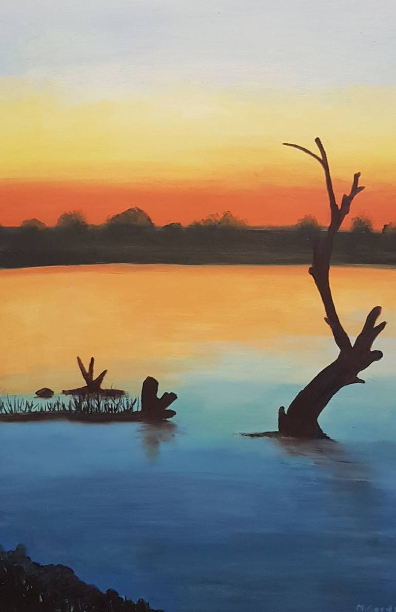 oil on wood A new painting of a landscape. Painted sunset especially highlighting the luminosity and color when the sun sets