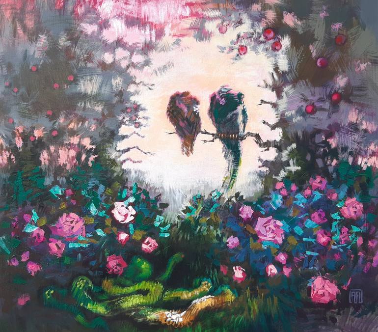I started with the concept of eden, where there are no people yet - but there is already the snake. Combining this with the latin maxim "Anquis in herba" (hidden danger, literally: snake in the grass) and the current threats situation, I imagined a dormant couple of birds. Pink tones can signify bot...