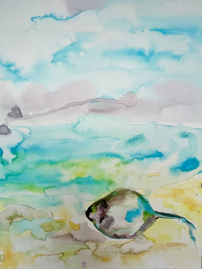 I painted this on my vacation to Antigua. My sisters and I snorkeled on the most beautiful day, seeing jellyfish and feeding stingrays