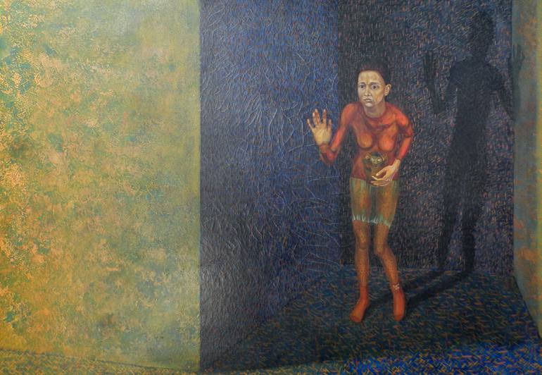 Fear makes us sometimes to want to hide somewhere, to enter into a wall. I painted this work in fear like a little monster that produces sensations in the stomach.