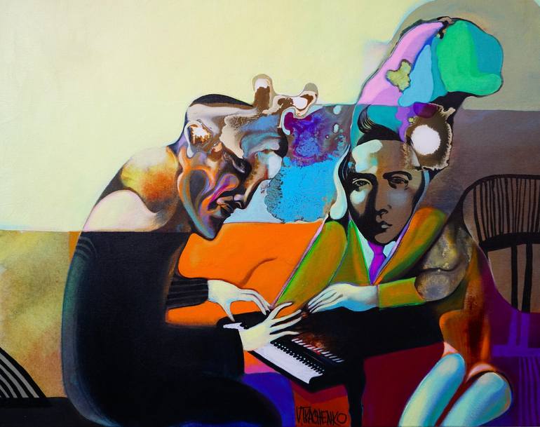 Victor Tkachenko, lives in Toronto, Canada. Victor received professional art training beginning at age ten and was one of few graduates to complete the extensive and rigorous program from the well-renowned Art School in Krivoy Rog, Ukraine. Working primarily with acrylic on board Victor displays a mastery of line and colour through purposeful brushwork and a palette dominated by rich earth tones thickly applied to the ground. The physicality of his work is enhanced with accents of ink and, intermittently, the addition of industrial materials such as varnish and plaster. Throughout the various stages of his work, Victor’s figurative forms are drafted with elongated lines, exaggerated features and geometric patterns. While early paintings are recognizable for their use of solid line and bold colour that refer to Byzantine mosaic work or stained glass, his oeuvre is grounded, broadly, in symbolism and expressionism. Dominating his art are planes of soft light which intersect and overlap, objects and figures emerge from a dreamlike atmosphere of harmonious colour while emotion and meaning are conveyed masterfully through bold pattern and vivid line. Victor’s work can be found at galleries and private collections all over the world.
