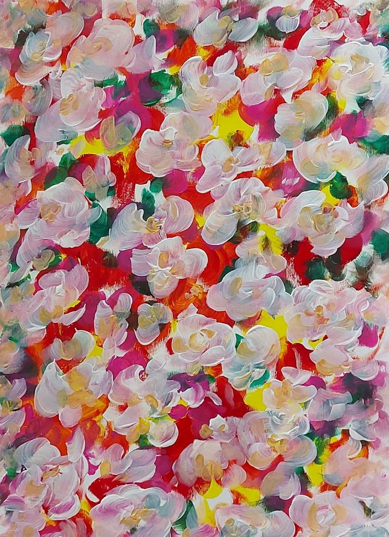 The garden is beautiful when the fruit trees are in bloom. The air is filled with an incredible honey aroma...bees are buzzing...translucent delicate flower petals flicker in the warm spring rays of the sun. The painting created on a high quality canvas textured acid free acrylic paper. Finished wit...
