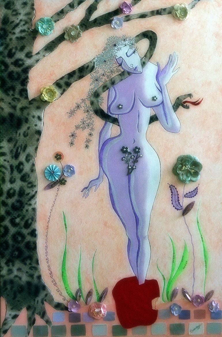 This is #4 in my "Famous Flirts" series--the "original" flirt in the Garden of Eden. The snake/tree is made from snakeskin fabric that is covered in clear sequins, the apple is made of a shiny red vinyl fabric, the flowers on the tree are 3-dimensional cardboard, the flowers in her hair have rhinest...