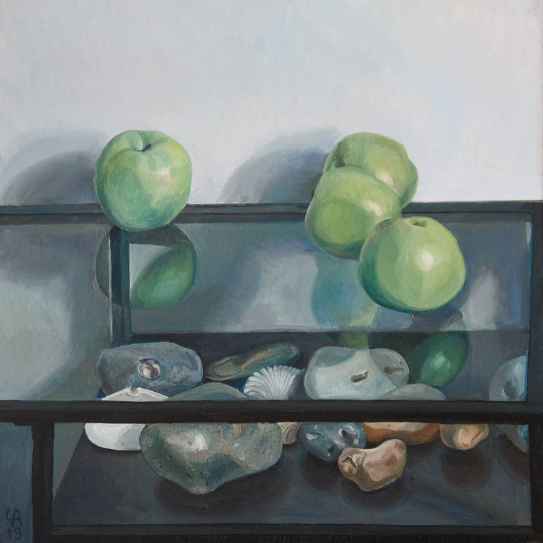“Apples and Stones” is a still life that captures the quiet beauty of everyday objects. Green apples rest on a glass table, accompanied by stones and shells placed on a lower shelf. Soft reflections and deep shadows created with oil on canvas form a calm, balanced composition, while the strong black...