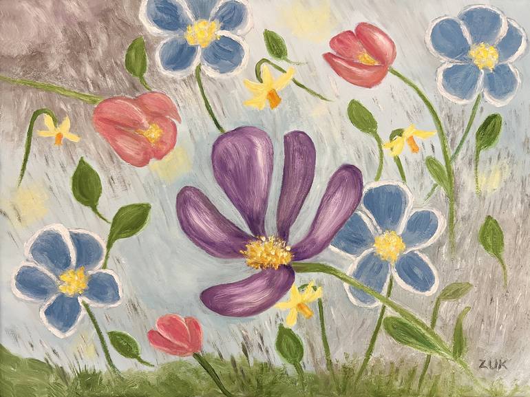 Spring flowers on a rainy day. Inspired by the song "April Showers". A variety of colorful flowers, including a large purple bloom in the center, is depicted against a softly textured background. Each flower, from the small blue blossoms to the delicate yellow ones, is painted with a thick, gentle s...