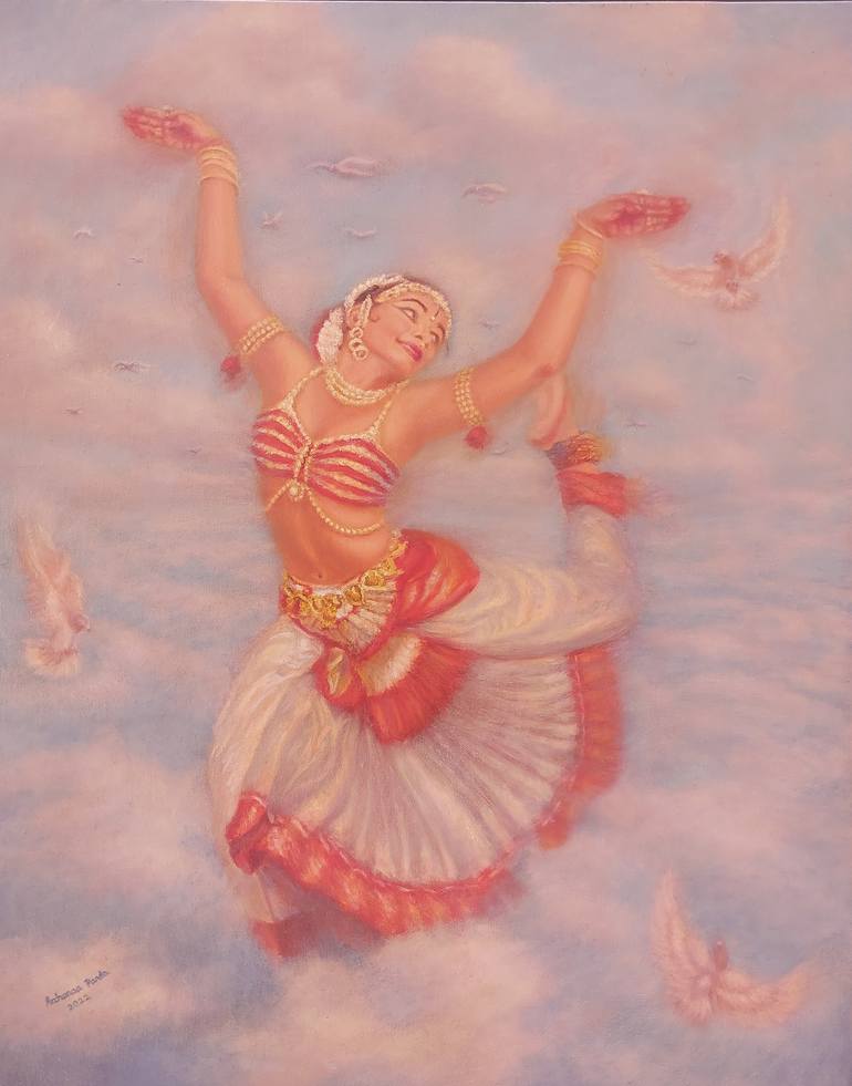 An ode to Indian classical dance, an expression of the phrase "dancing gives wings" depicting an Apsara or celestial nymph dancing in heaven with birds looking on in awe. It belongs to the genre of romanticism and surrealism. Oil on canvas, 24 (W) * 30 (H) * 1 (D) inches. Available as rolled canvas ...