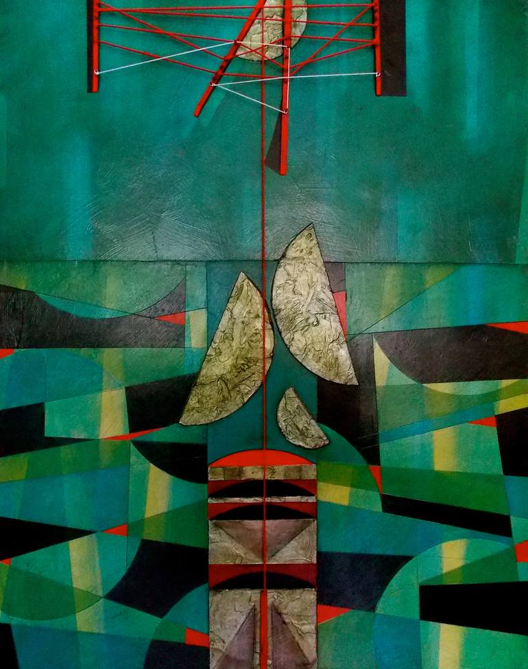 This mixed media painting is based on a feeling that a vast sea might suggest. It has a quietness about it. The painting is on Rino Board and includes wood, yarn,oil paint and texture.