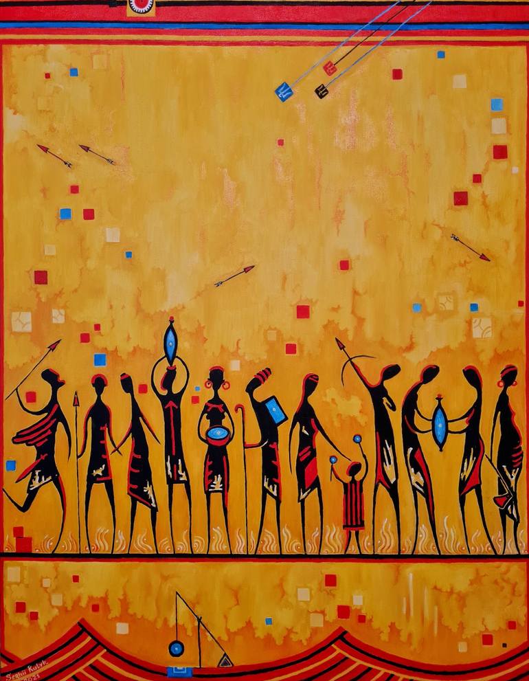 The artwork is framed by a narrow red border. Stretched canvas, oil paint. This original artwork is made in a single copy.