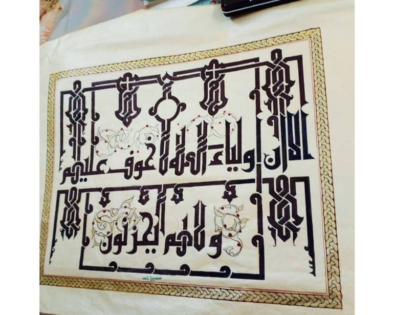In this painting, a qur'anic verse is written in modern Kufic style.
