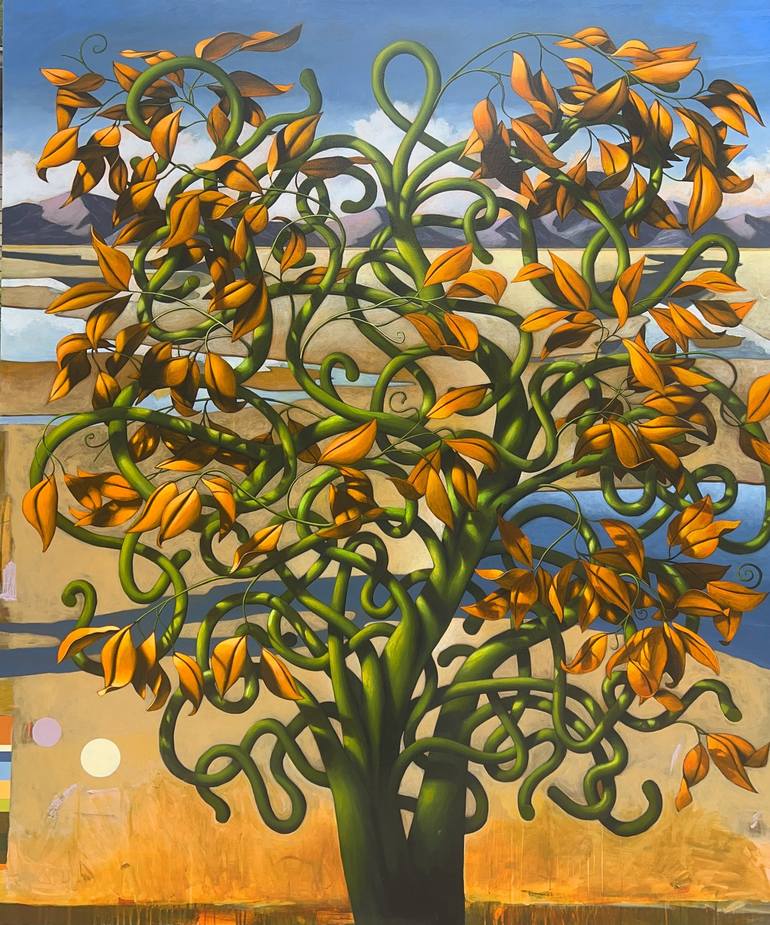 This is the second version of this winding vine tree. A “fall season” interpretation of the first. There are some fluorescent pigments added for increased luminosity and effect. A simplified landscape, with a classical flavor leaning into surrealism. Three layers of high gloss varnish give additiona...