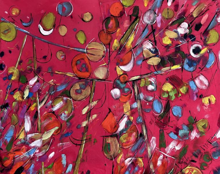 Radiating energy and vitality, this expressive painting bursts with life against a vivid red silk background. Abstracted branches and circular leaf-like forms intertwine in a dynamic dance of color-crimson, gold, blue, and green-suggesting growth, connection and renewal. The flowing black lines and ...