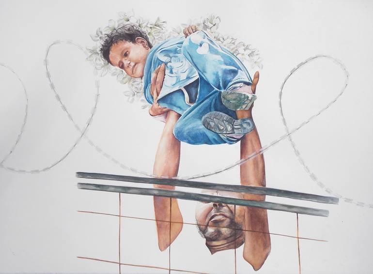 This is the second piece in my new series on the refugee situation. This little girl is being lifted over a fence, mos likely into another country. It is unclear if her family made it over the barbed wire. She is cloaked with Jasmine Flowers, the flower of Syria, as protection