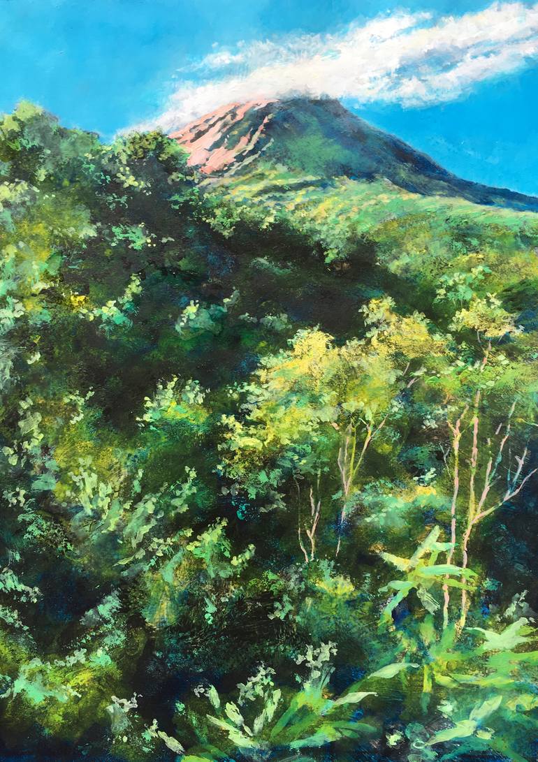 The Arenal Volcano sits in the central Costa Rica highlands. This was the magnificent view of the volcano surrounded by lush forest from our hotel window. The top of the volcano is seemingly always hidden with vapour. I have attempted to contrast the bright pink sunlit hillside with the deep blue gr...