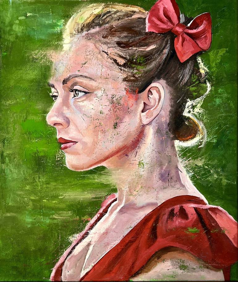 "Aries" captures the poised strength and elegance of its subject, framed in a vivid contrast of red and green. This oil painting showcases a woman in profile, her intense gaze set against a textured, emerald backdrop. The detailed red bow and dress add a vibrant focal point, highlighting her determi...