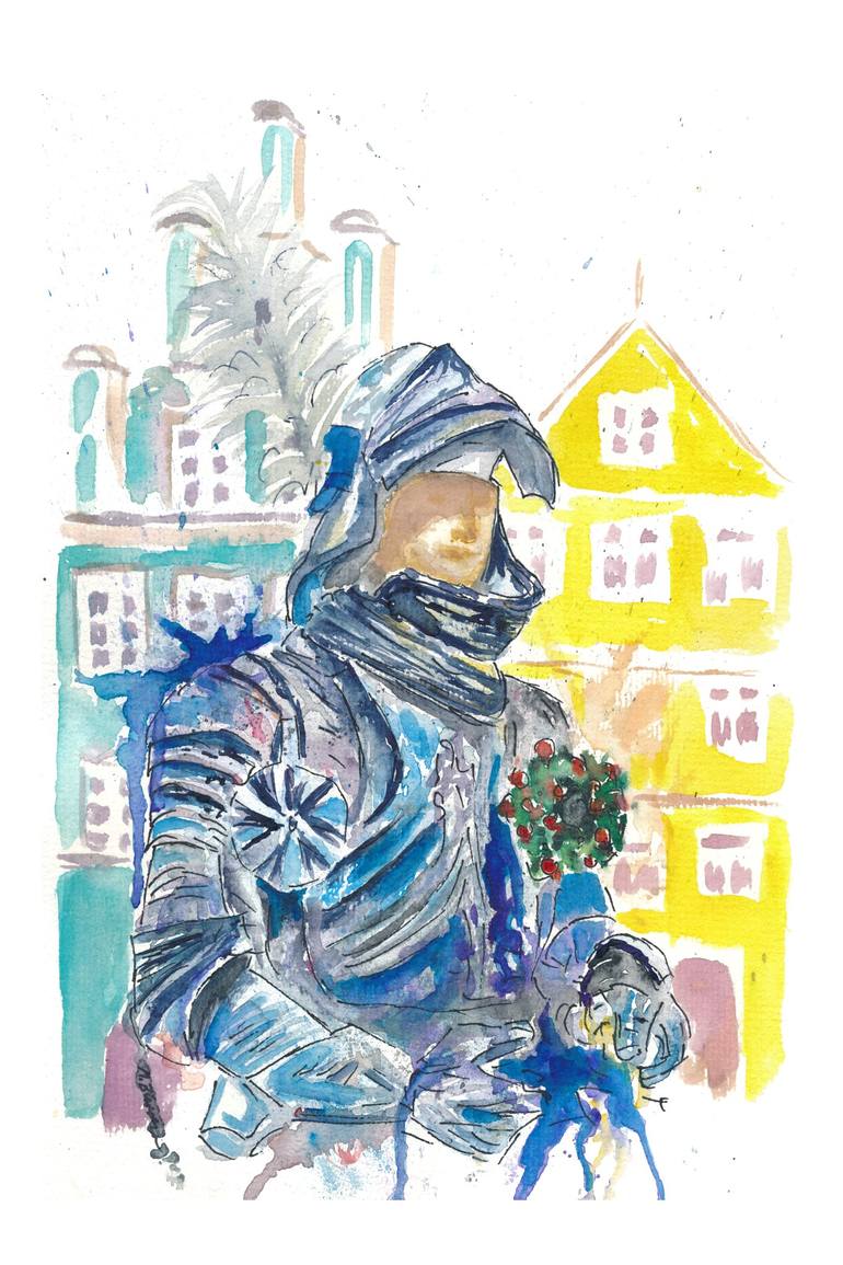 Armored Knight with Medieval Old Town Houses in Landshut Bavaria - watercolor on paper