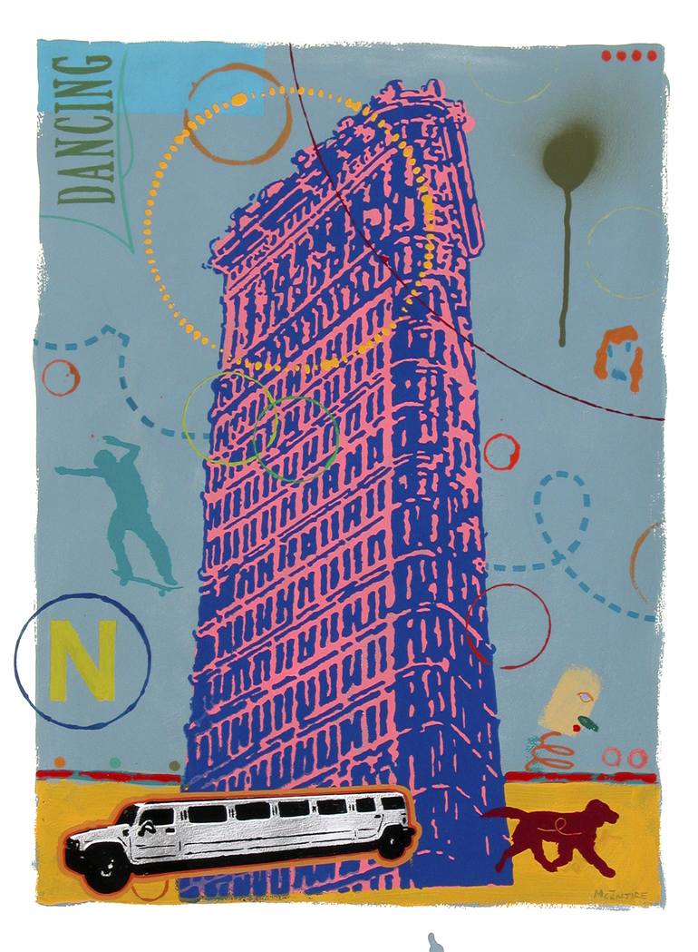 Painting in high gloss enamel on Arches acid free paper. First layer is hand painted blue gray background. Second layer is a 2-color silkscreen print in reflex blue and magenta enamel paint. Layered next with stenciled lettering, rollerblader, dog and limo and finally various hand painted marks.