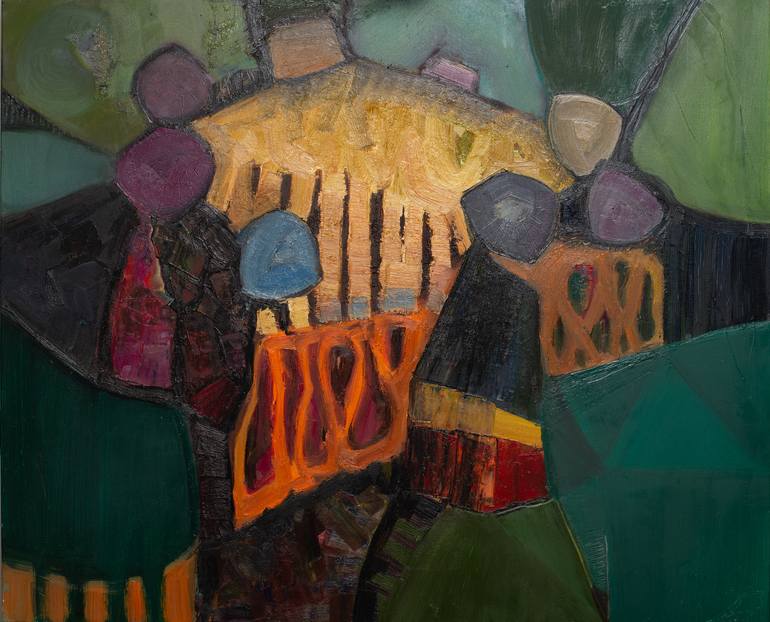 Painting inspired by ancient Baltic and Scandinavian signs. Close to abstract. Vivid colors.