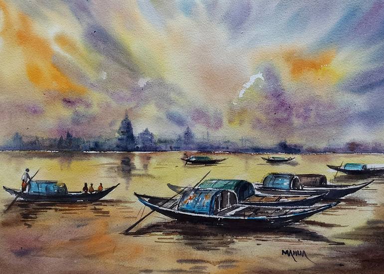 Who does not enjoy the arrival of a new day, a new dawn? It brings with it hope and vigour! This water colour on Paper Landscape Drawing Depicts a typical river scene in India where fishermen are up early to haul the fresh catch of the day as the sun gradually rises in the horizon, a ethereal sight ...