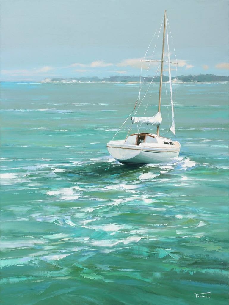 The sailboat is sailing towards its destination. A beautiful island awaits you at your destination. Feel the waves and energy of the blue sea in my work.