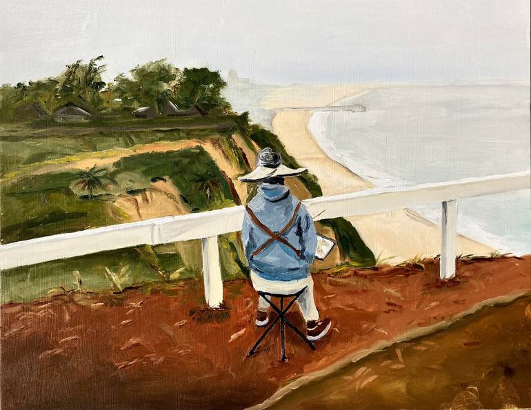 I paint with an artists' collective on a monthly basis. We were perched on a bluff overlooking Santa Monica on a murky day. One of my fellow artists caught my attention. This work is framed and ready to hang.