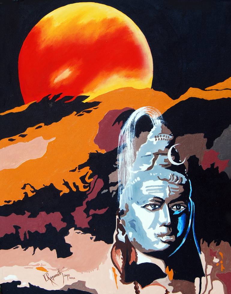 Title: Artistic Vision of the Almighty Contemporary art with graphic style. The Moon is giving a Boon the to the landscape that would change soon to a spectacular bonanza, spread over a surface of Kailasha Manosarovar , on a Golden plate, higher by 5580 meters above sea-level. The Moon is eclipsin...