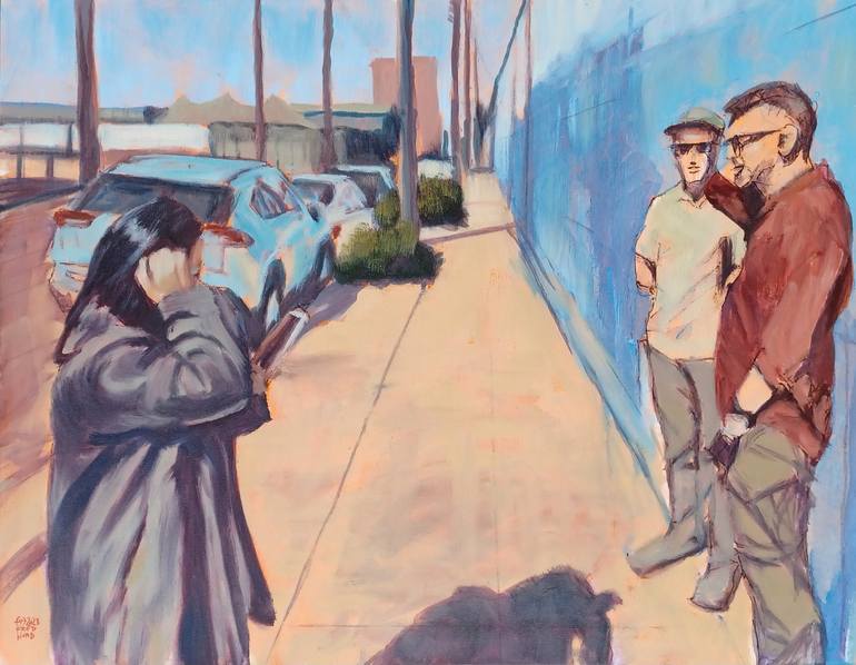 "Artists at 8th & Mateo, Los Angeles" is a captivating, small-sized original painting that captures a vibrant urban scene. The artist skillfully blends ink, charcoal, acrylic, and oil paint on canvas to bring this narrative to life. The contemporary artwork depicts figures in a photorealistic s...