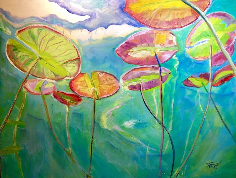 I was inspired to paint this scene while snorkeling. As I was returning to the surface, the beauty of the colors and objects hitting the underside of the water were astounding.