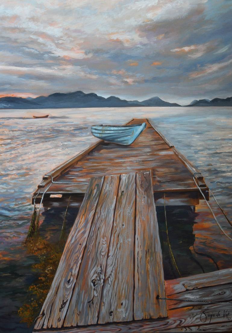 Feel the soft breeze in your hair, hear the silence fall as the day is done... The blue-greys and contrasting oranges of the sky reflect on the water as the last rays of the day vanish into the dark. With it comes peace and tranquility; my hope is that this portrait will bring these feelings to it...