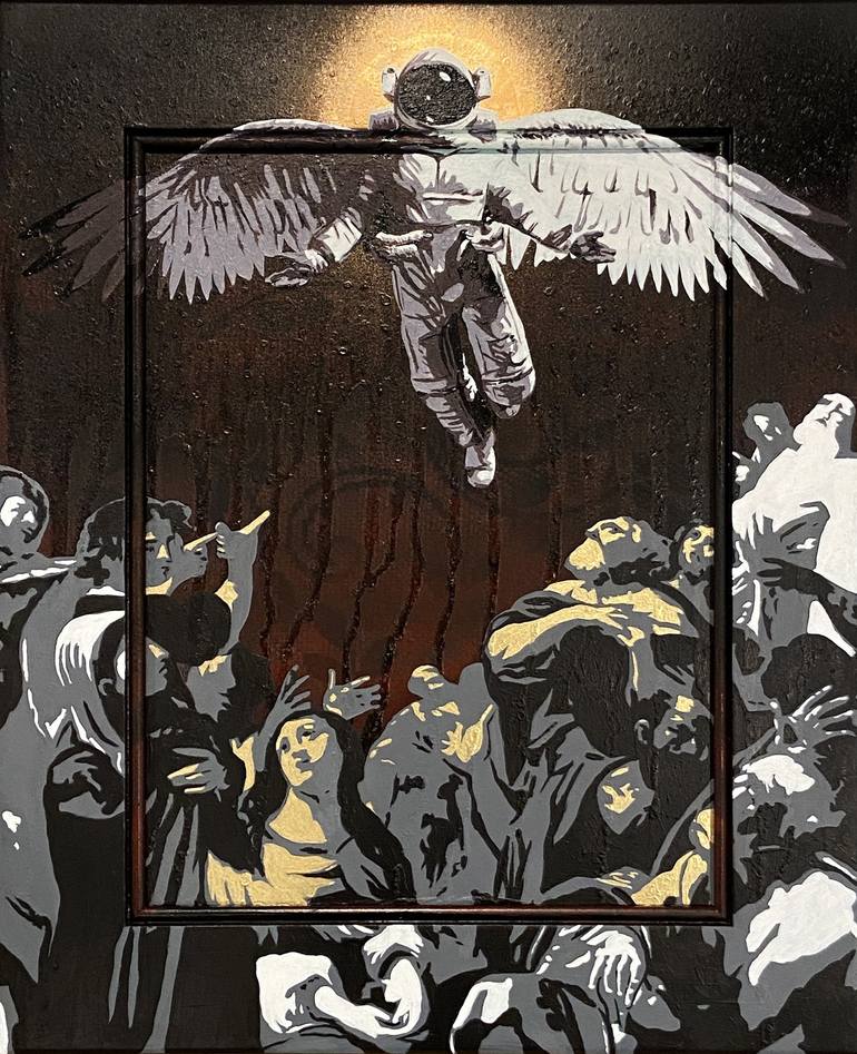 This work was created is response to a group show that I participated in. The theme was "angels." I was interested in creating something different from the typical religious imagery people are used to seeing. I liked the idea of the astronaut floating all alone in space. The figures underneath were...