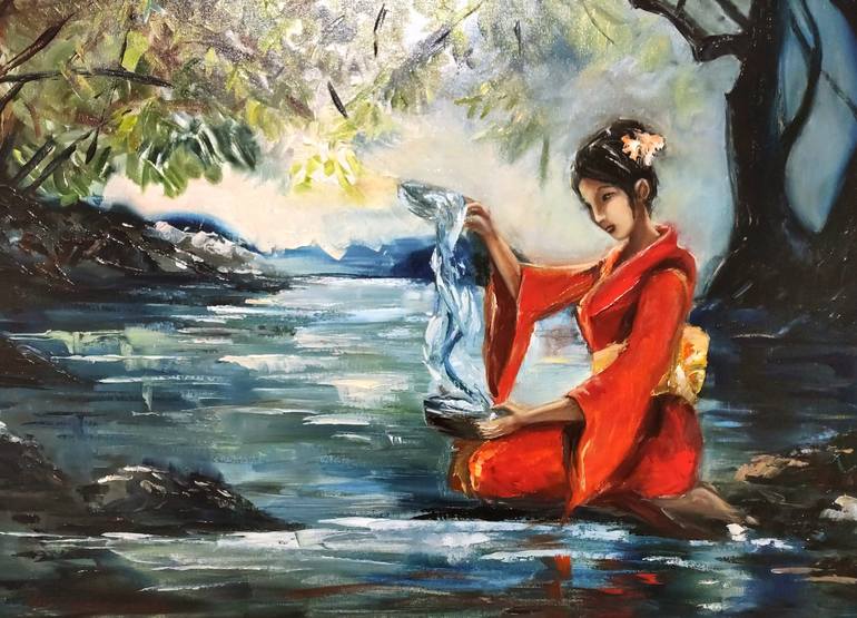 Girl and Water Oriental Landscape A Girl and the Water 2018 Original Oil Painting on cotton stretched canvas Size 19,7x27,6 inches (50x70 cm) Sides painted the same colors Ready to hang Unframed Signed Vanished Asian motive painting with traditionally dressed girl and magic colors sunrise brings...