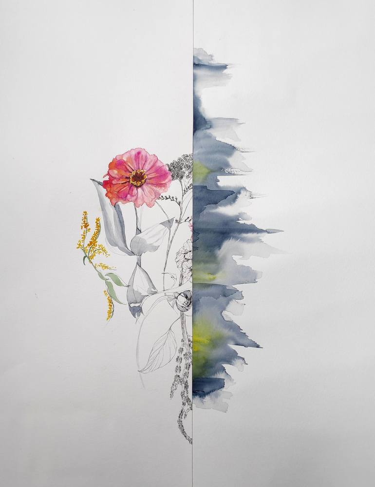 Painting of a summer bouquet of asteracea added to an abstract part. Watercolor and ball point pen on paper. The flowers grow in a farm in the Alps and are sold only in a tiny French market. They are fresh, local and natural. The painting was made during hot days in August 2024 in my patio. Asteracé...