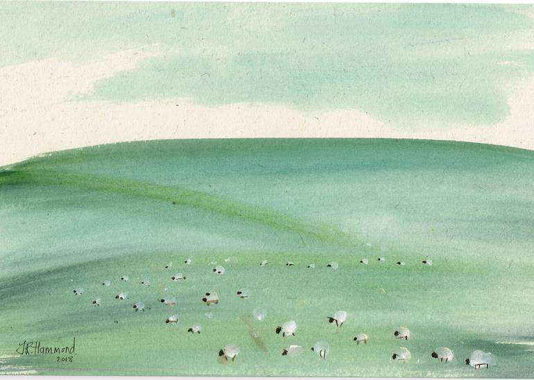 Landscape painting by contemporary British artist Jacqueline Hammond Acrylic painting on paper depicting sheep grazing in green fields. Part of a series of studies of animals to be incorporated into larger scale paintings as subject or background. Title: At Night I Dream of Acrylic Sheep - Ten Me...