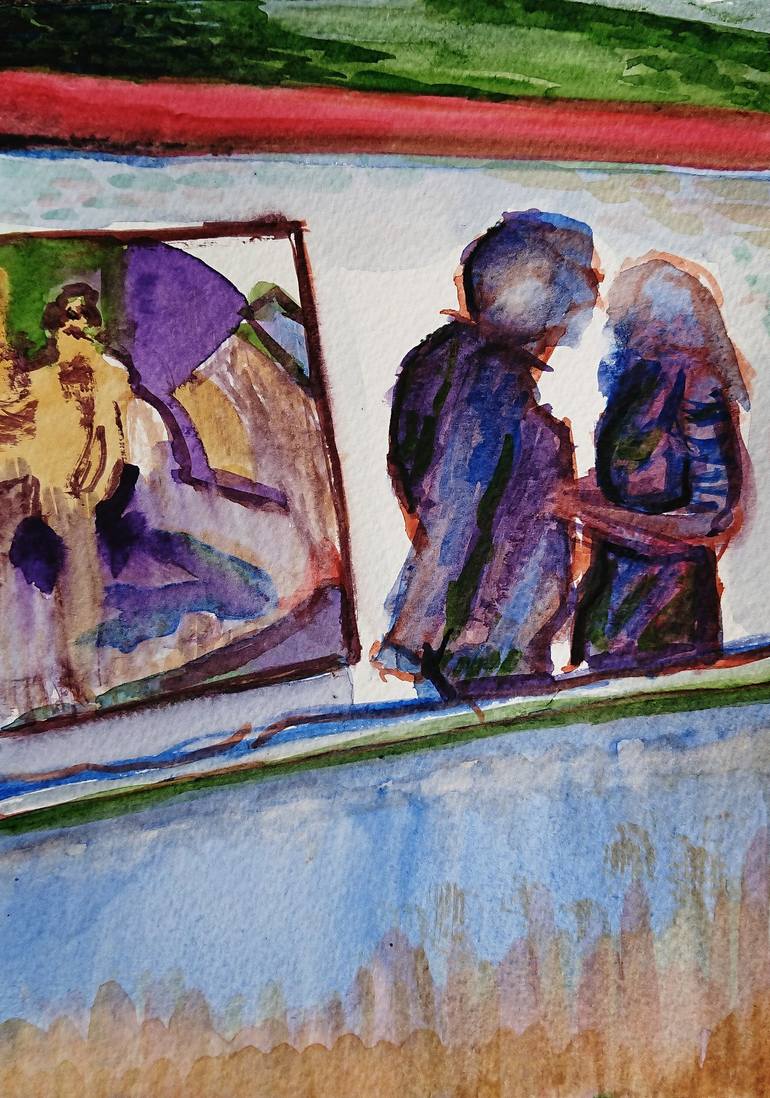 Watercolour on 300gsm paper. 2025 Based on a photo capturing a fleeting moment between two people. Taken while at the Guggenheim in New York.