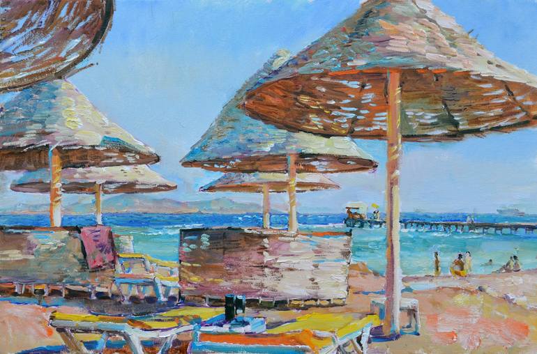 The picture has a wooden frame, a gallery stretch of the canvas, so it can be exhibited without a frame. Professional oil paints, texture, and acrylic imprimatur are used here. On the Beach is made in the style of Impressionism from nature. The place depicted in the picture is the Egyptian resort of...