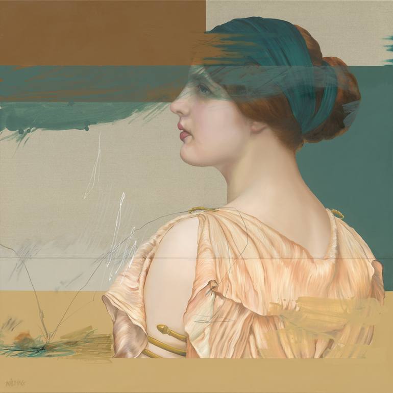 The women’s portraits of Academic Realism, in classic/antique clothing, represent an idealized, romantic and intact world. As a result, they radiate longing and melancholy, which Anja Wülfing surrounds with oppositional, abstract elements and geometric forms. She sews together fine and coarse canvas...