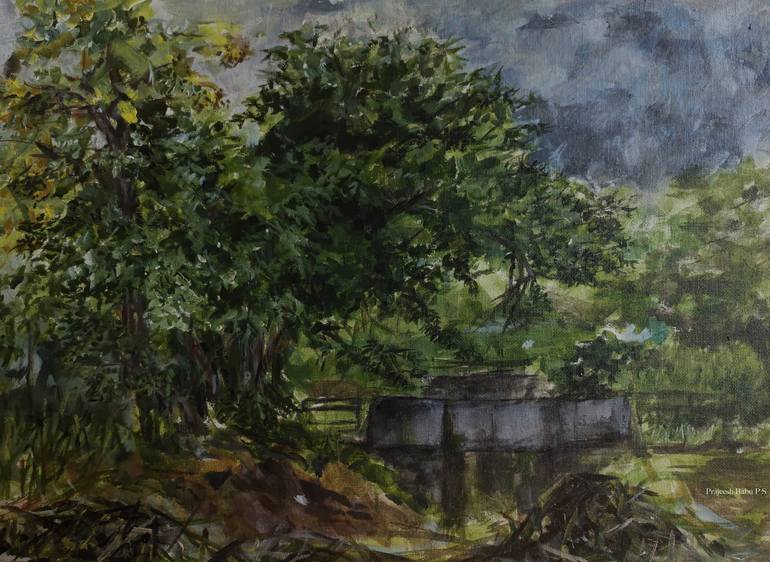 “Athāni” is a tranquil landscape painting inspired by a small resting place under a tree and bridge- where I would pause, tired from my 2 km walk from college before taking the bus home. In Malayalam, “Athāni” means a simple spot of rest, a place where travelers find relief on their journey. Thro...