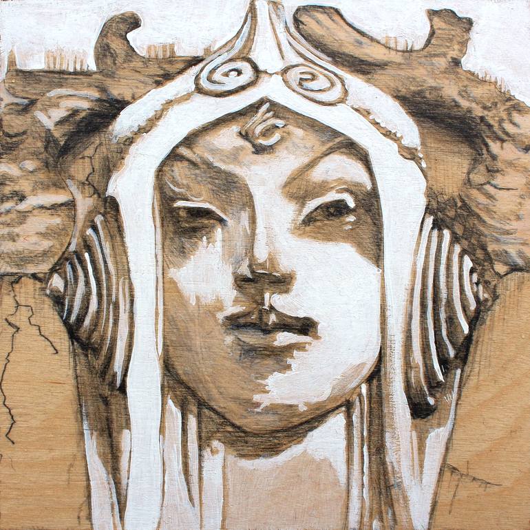 When painting, headdresses and crowns deify Kate Kelton’s subjects. She uplifts the Unsung Sheroes & Heroes, Patriarchy Smashers, Warrior Survivors, Silence Breakers, Philosophers, Truth-Tellers, Whistle Blowers and Thought Giants of all stripes. She paints her portraits cloaked in the garb of statues Ladislav Šaloun sculpted onto the train station that her great-grandfather, Josef Fanta, designed for Prague in 1901 - 1909. Apotheosis through a reclaimed, reapplied Art Nouveau. Sampling her own lineage, she transforms a historical body of work, itself a thing of lasting beauty; exchanging granite for graphite, plaster for paint. In Photoshop, she first combines the desaturated faces she's found, sourced or shot of her chosen subjects, with the black and white photos from her family and friends, of the statues in situ. Then she uses graphite, inks and acrylic paints and glazes to create the works on panel or canvas, literally uplifting and elevating her battle-weary subjects to the highest reach of architectural strata. 'Ancient and distant godlike beings, surveying a dying empire, trade places with the fresh blood of her subjects. The work presents a tactility against the digitized space, and represents a taking, an acquisition of power back from the tastemakers. Here, the mantle of the artist is above brand influencer, above internet commentator, above mere marketability. In their gaze is a warning, “Art is immortal. Come for me, why don’t you?”' ~ Micah Chaim Thomas "Kate's recent work is a matter of expansion through contrast - she is as ephemeral as her subjects are concrete architecture; she is structural when her subjects should slip through your fingers like too-fine sand. Taken as a whole, the works in her magnificent series Sentry are incredibly intelligent, but when looked at individually, you come to understand that these are statements of life beyond themselves. The series take embellishments of a Prague train station designed by her great-grandfather, Josef Fanta, and combines these with portraits of women who have stood against the sexual harassment and assault rampant in Hollywood. These women, like Kate herself, have suffered in the era where powerful men, every bit as immovable as the train station, wielded their power without check. The portraits emblazoned on architectural elements, they are marked against the edifice, every bit as permanent, and perhaps even more defining.