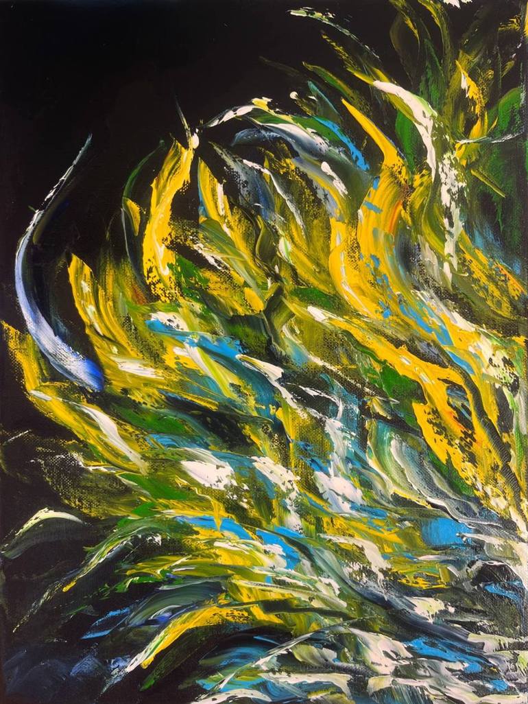 Hello my viewer! I love the mystery that art can evoke, and this painting is a vivid reflection of that sentiment. This abstract oil painting bursts with energy, featuring bold, sweeping strokes of golden yellow, emerald green, and electric blue against a deep black background. The dynamic compositi...