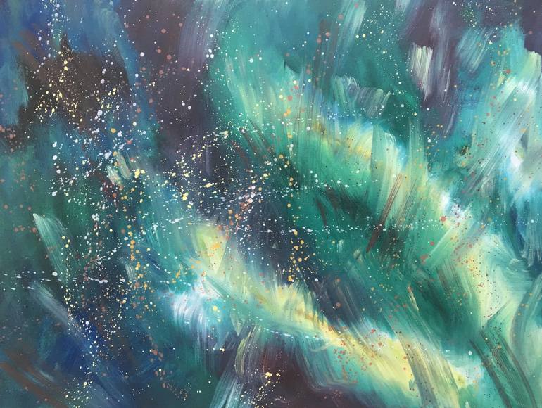 Aurora Borealis streaming across a northern Canadian starry night sky inspired me to paint this shimmering image. The natural electrical phenomenon characterized by the appearance of streamers turquoise light in the sky, influenced by the magnetic North Pole was mercurial to say the least. I still...