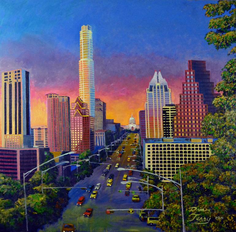 The rapidly changing skyline of Austin inspired this canvas to capture the dynamic city dramatically at this moment in time as new skyscrapers are already in process and this skyline in just a few years will be altered enough that even this image will seem quaint to future visitors to one of the mos...