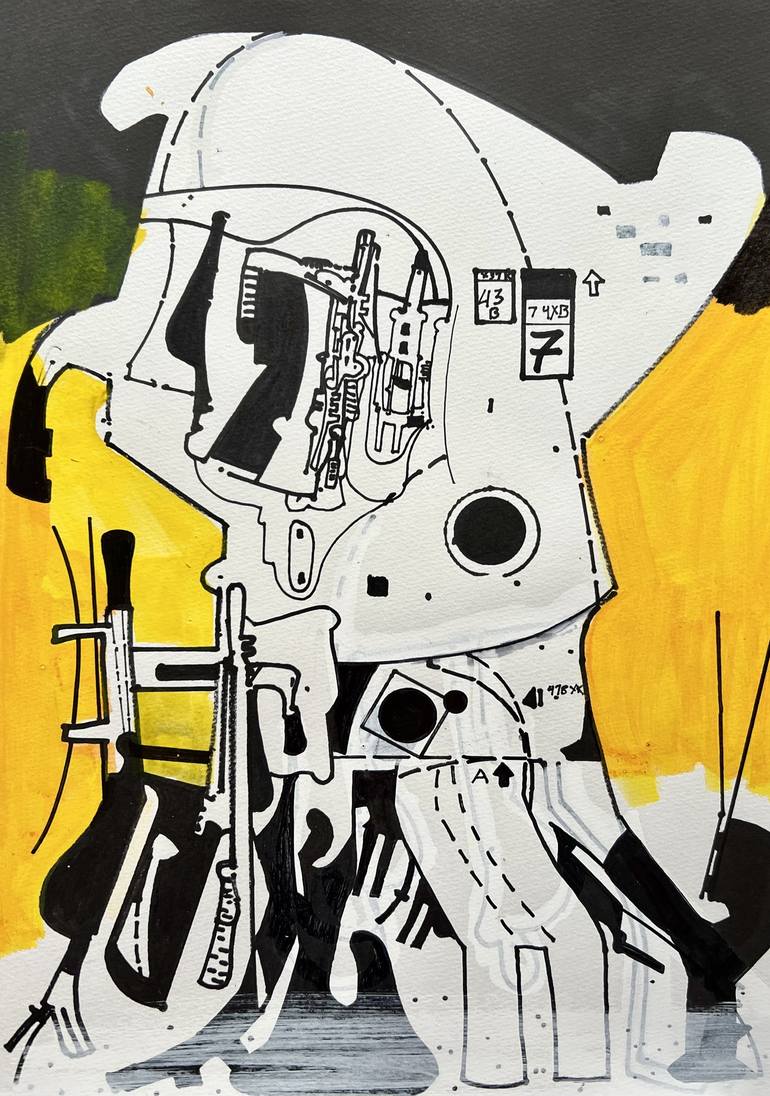 Ink and acrylic marker on paper 9.85" x 13.85" October 29, 2025. Future tense, glitch in the cerebral manifest, future technologies, Offworld installations, High Energy Optics, Shinjuku neon, SSTV (Slow Scan Television), hallucinogenic image scans, Tactical operations center, organic prototypes, cov...