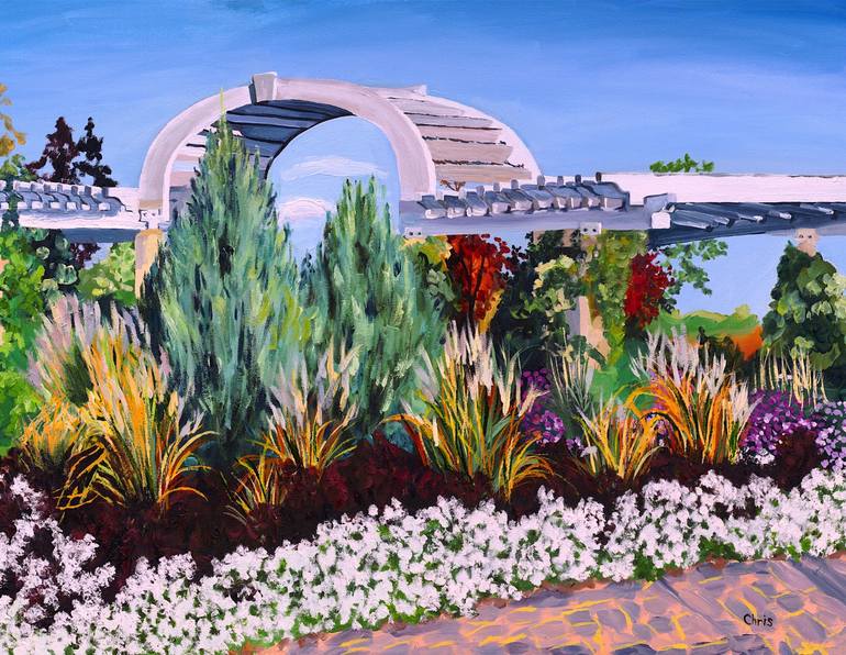 Painted on-site at Longfellow Gardens in Minneapolis in Oil on Canvas. Features a view of the white-painted arbor with climbing vines, ornamental grasses and evergreen trees, late-blooming landscaped plants in burgundy, white, and purple, and glimpses of orange-red autumn trees behind the arbor. T...