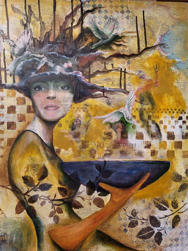 The subject of the painting is a woman with her organic headdress covered with clouds and surrounded by flying doves. This painting focuses on exploring womanhood, celebrating female strength and wisdom. The headdress symbolizes life’s obstacles that create challenges. The shadows of the eyes refl...