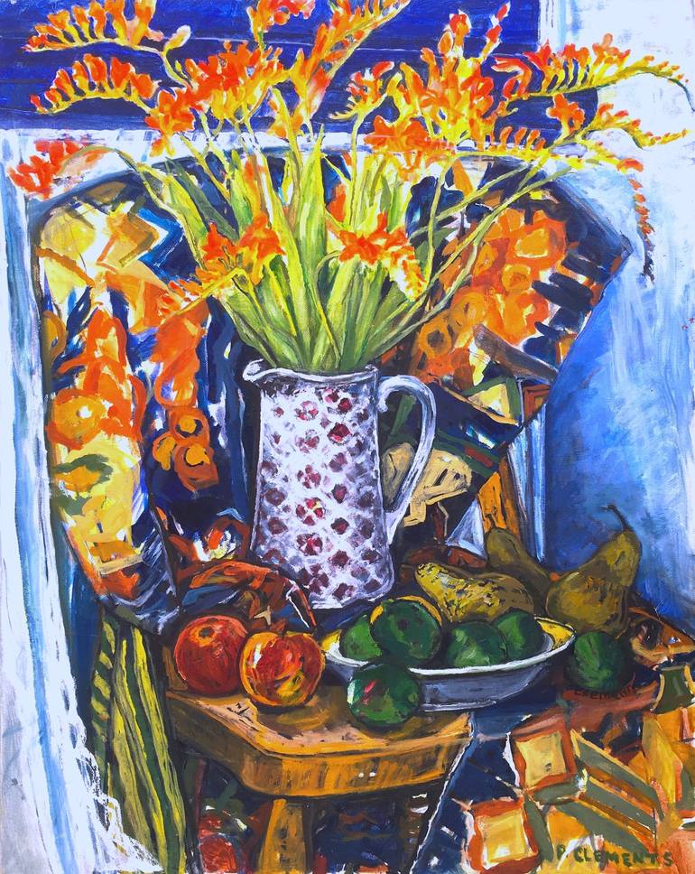 This is an oil painting of an array of fruit, flowers and coloured material resulting in warm autumnal colours. I like the russet tones of the apples contrasting with the green of the pears. The background material echos this theme and is a still life which can be hung without a frame or with is p...